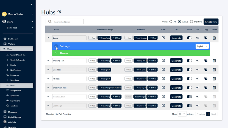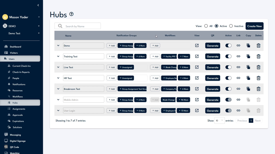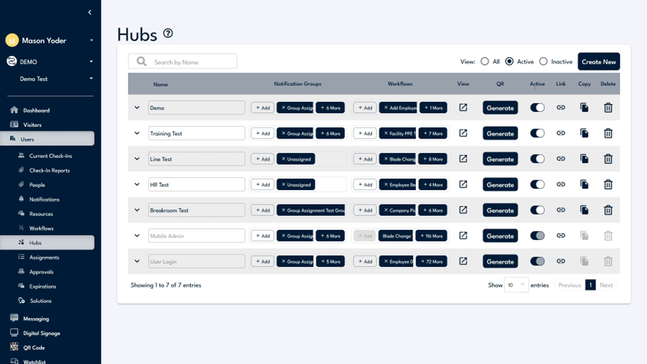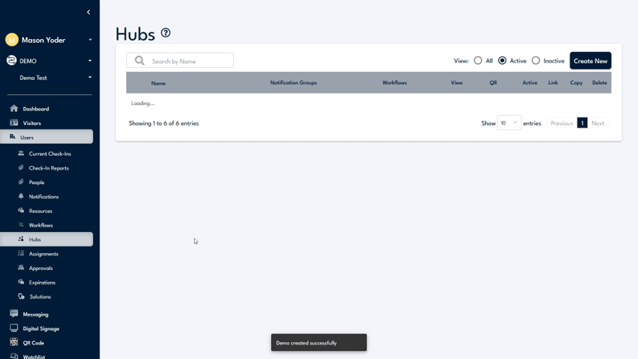 To initiate, select the 'Users' option followed by 'Hubs.' Here, you will find a list of all your active hubs. If you wish to create a new hub, click on the 'Create New' button and enter a desired name for the hub. This name will also appear on the kiosk for the end user.