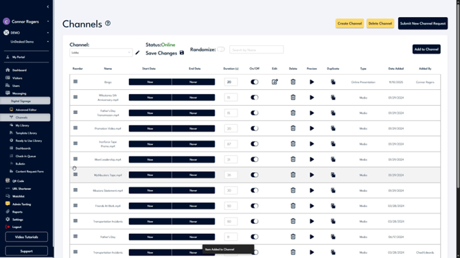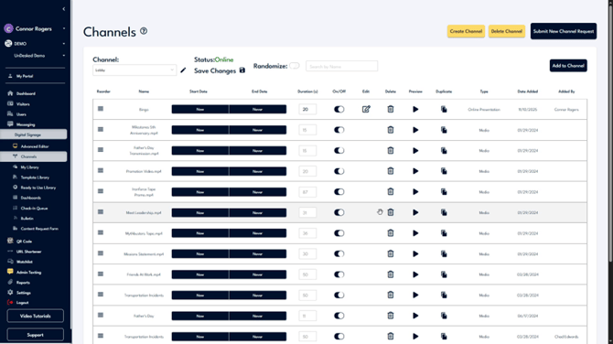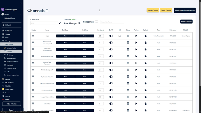 Within the channel interface, you can rename the channel, check their online status, randomize the content, or save and update the player content. All content associated with the channel is displayed below. You can reorder this content and review information related to each piece.