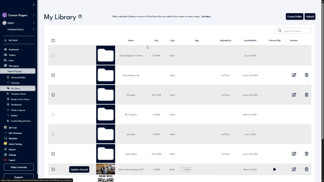 To begin managing your digital signage library, log into UnDesked. Click on the "Digital Signage" dropdown and select "My Library." Here, you will find all your digital signage resources available for assigning to your channels.