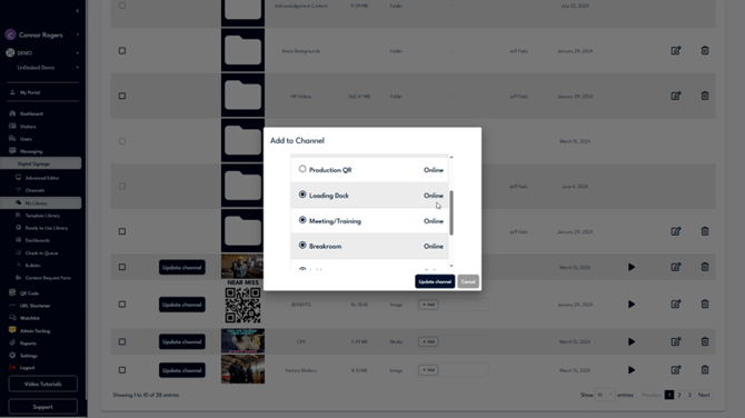 To add content to your channel directly from the library, locate the desired content and click on "Update Channel." A list of your digital signage channels will appear, allowing you to assign the content to one or more channels.