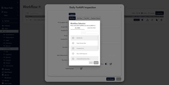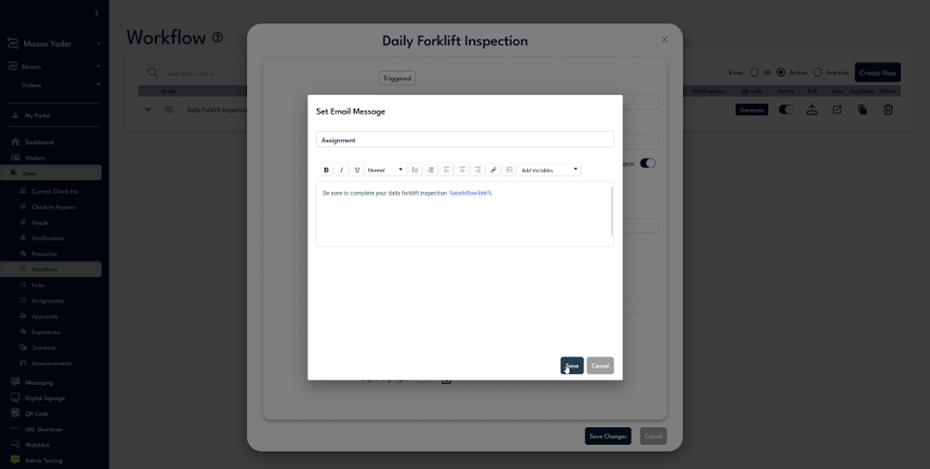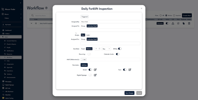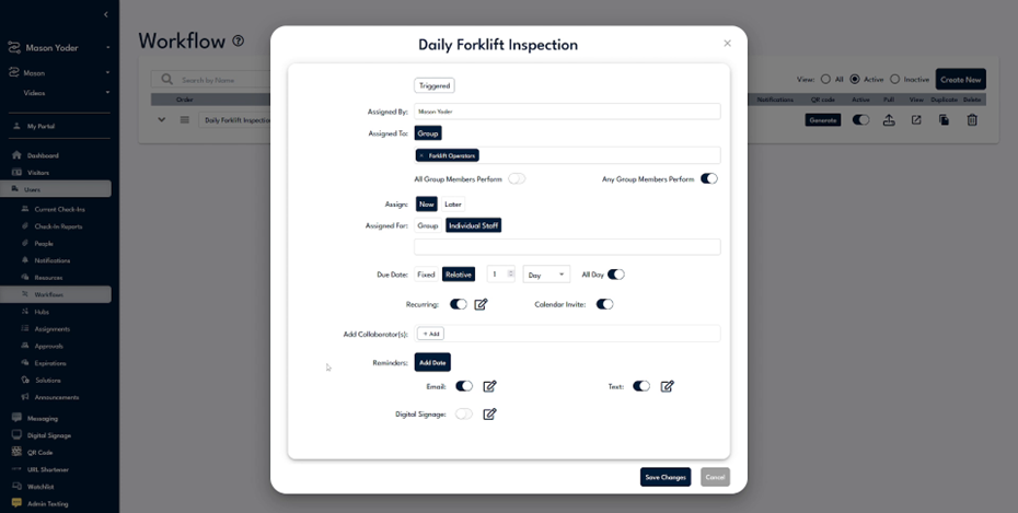 Explore a daily forklift inspection workflow to assign it to the forklift team every day. Select the assign option, where numerous options are available. You can make this a triggered workflow, meaning it will be assigned whenever another workflow is completed.