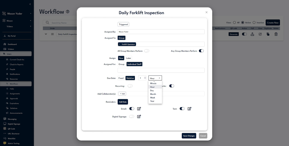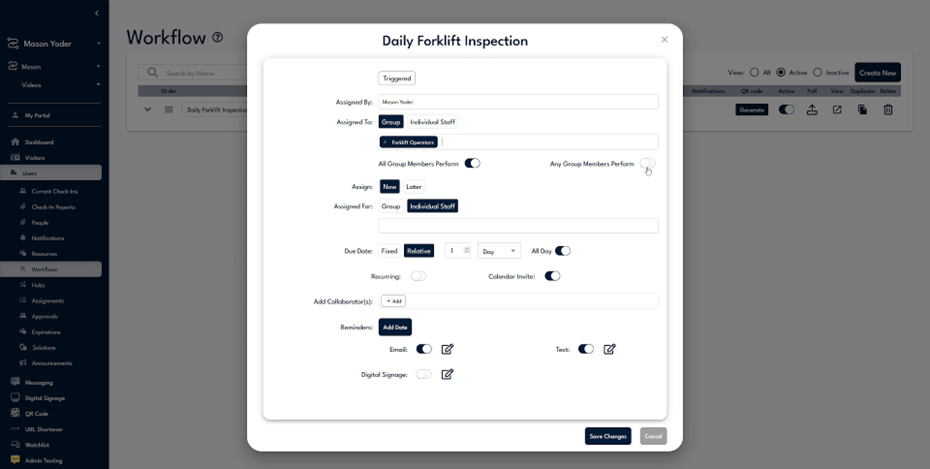 You can assign the task to specific individuals or to a group. By entering names, tasks will be assigned directly to them. Alternatively, use the group option to assign the task to a group, such as the forklift operators who will complete the inspection daily.