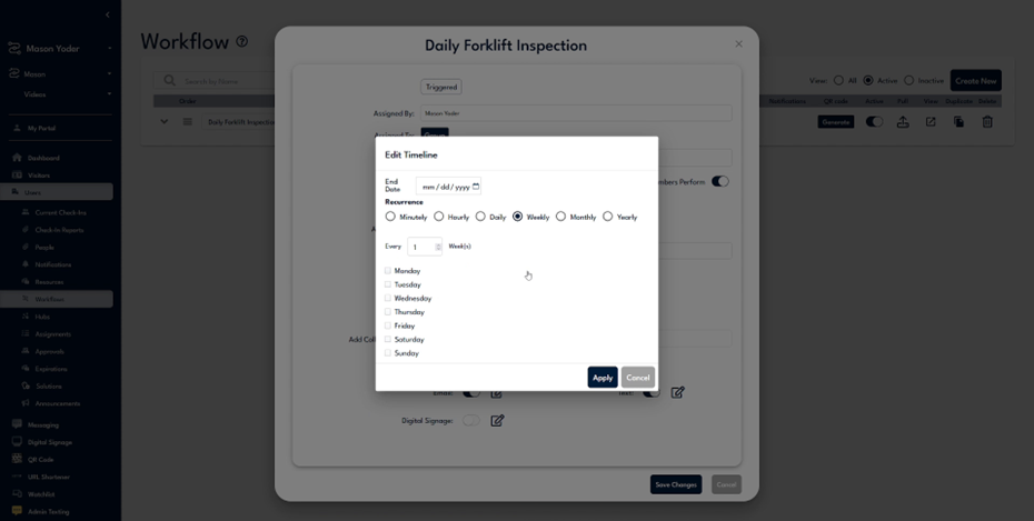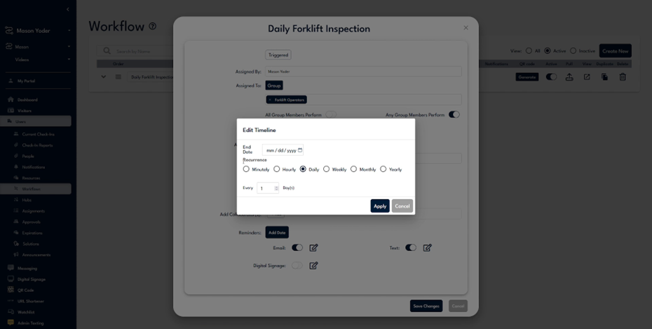 Set a recurring schedule and adjust settings as needed. For daily forklift inspections, set it to recur daily. Determine if there is an end date for the recurring assignments.