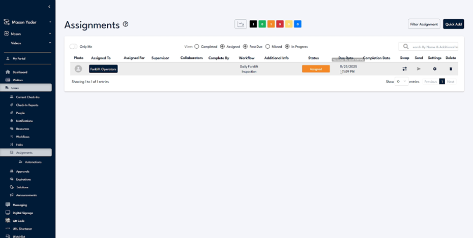 The assignments feature is a valuable tool for maintaining workflow and information flow. For further assistance or questions about using assignments, contact the support team for help.