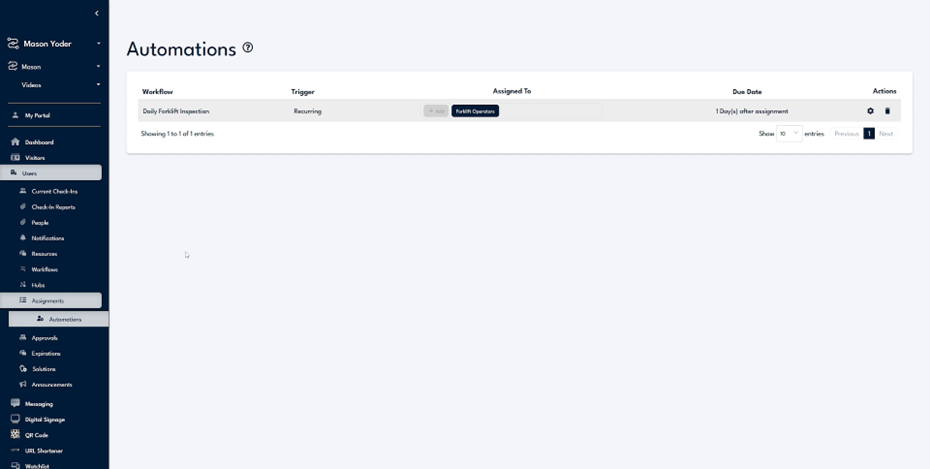 Check the automations tab to confirm the daily forklift inspection's recurring assignment and its due date. Adjust settings quickly if needed, using the available options.