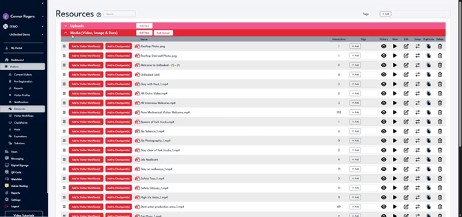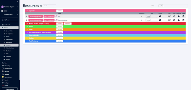 To access your resources, click on either "Visitors" or "Users," then select "Resources." This will display all the different resource types available in UnDesked. Uploads are documents you may need from users, such as an I-9 form, passport, or driver's license.