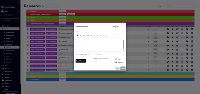 Acknowledgements and agreements require user consent via a click or signature. To create a new acknowledgement or agreement, click "Add New," name it, set the reserve period, and enter the agreement text. You can also upload existing documents such as text documents or PDFs by clicking "Select Content."