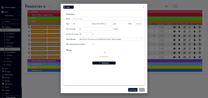 Tests can be scored and may trigger workflows or other resources based on pass or fail outcomes. To add a new test, click "Add New," name the test, set a reserve period and retry period if desired, then define the pass-fail parameters.