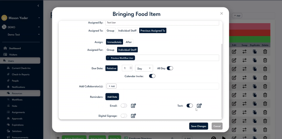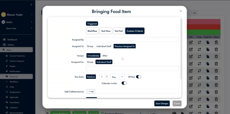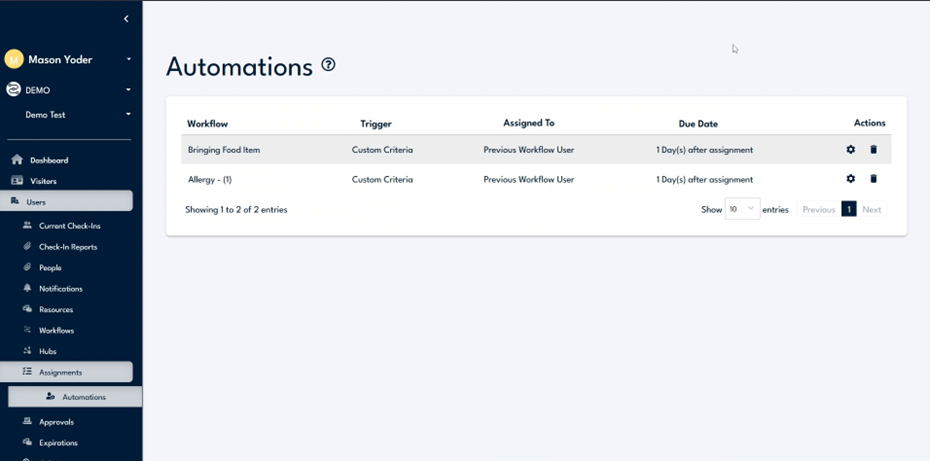 Navigate to the assignments and automations section to verify the "bringing food item" workflow. Confirm it is triggered by custom criteria and will be due one day post-assignment. Use this section to make quick edits if necessary.