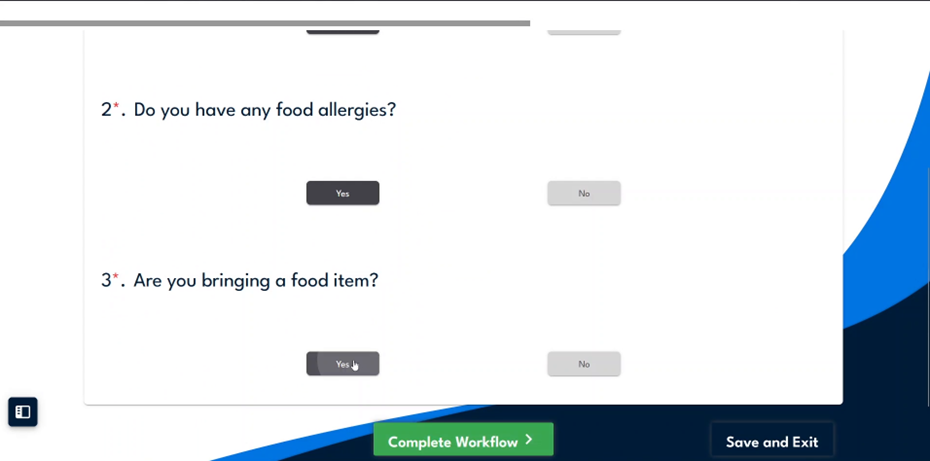 Review the list of questions on the form and select the one about bringing a food item. Specify that the task should be assigned if the user selects "Yes" to bringing a food item.