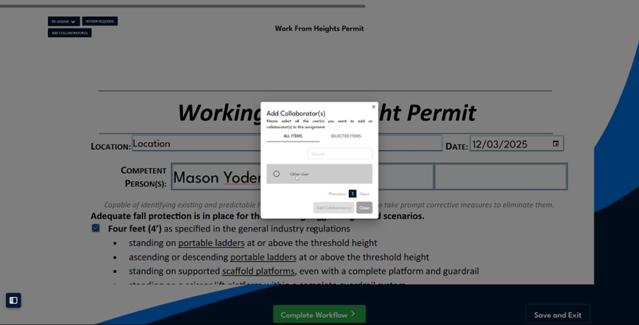 Select another user to become a collaborator. Then, switch to that user's account to proceed. In their assignments section, you can view that they have been added as a collaborator to the work-from-heights permit.